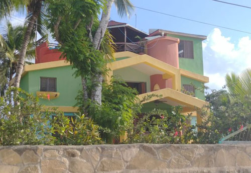 This two-level block building houses two self-contained casita bedrooms, each with a private entrance, private bathroom, two double beds, and attached private balcony. The upper casita has an unobstructed ocean and beach view.